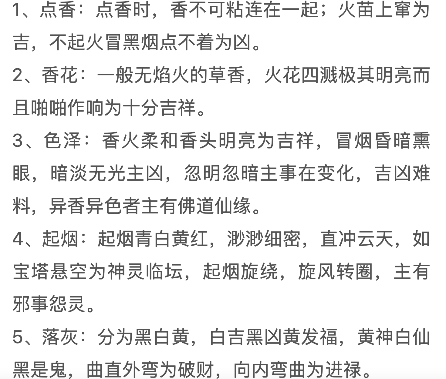 在一些传闻中,三炷香燃烧时长短不一也是有不同的说法的,第一种叫做平安香,就是香的长短始终保持一致,第二种叫做禄香,左边的香比右边高,但是又低于中间的香,预示着官运会发生变化,第三种是大、小天真香,香左右持平低于中间,意思是神仙降临,第四种是大、小莲花香,这种香一般是两边的高于中间的,意思是近日会有好事发生,第五种香是催命香,就是左边和中间的齐平,右边的低于两分之一,意为近日可能会受伤或者丧命,这种香是凶兆,还有一种香孝服香,就是右边的香略短于另外两只香,意思是最近家中会有丧事。