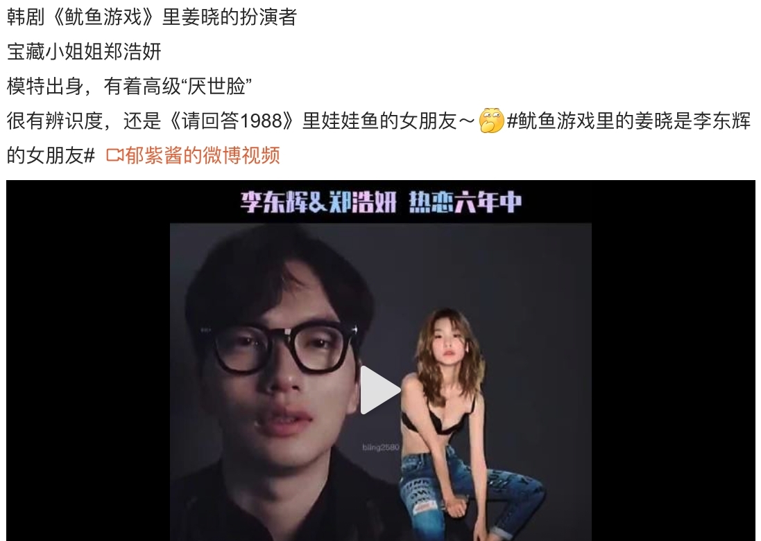 说起李东辉的女朋友,就不得不提今年大火的《鱿鱼游戏》了,这部网飞剧让韩剧杀入了欧美市场,在全世界范围内引起讨论,算是今年最火的剧了,而在《鱿鱼游戏》中饰演姜晓的演员,就是李东辉的女朋友郑好娟,郑好娟从前是一位模特,《鱿鱼游戏》是她的第一部剧,在2016年,李东辉和郑好娟公开了恋情,从15年两人开始交往,如今已经在一起六年多了。