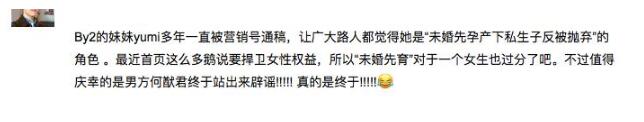 By2的妹妹yumi多年一直被YXH抹黑,让网友们都觉得她是“未婚先孕产下私生子反被抛弃”的角色 ,“未婚先育”对于一个未婚女生来说确实很过分,还好何猷君也出来发文,证实这个虚假传闻。