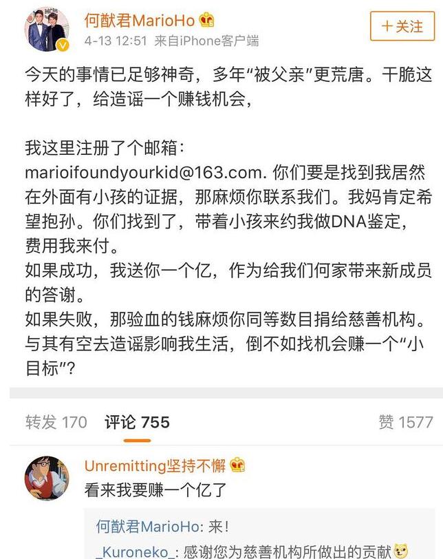 何猷君也发文称:“今天的事情已足够神奇,多年“被父亲”更荒唐。干脆这样好了,给造谣一个赚钱机会,我这里注册了个邮箱, 你们要是找到我居然在外面有小孩的证据,那麻烦你联系我们。我妈肯定希望抱孙。你们找到了,带着小孩来约我做DNA鉴定,费用我来付。”