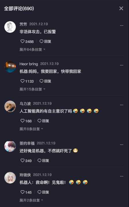 评论区的小伙伴们也开始纷纷化身机器人,开始编段子了,比如有的说:“妈妈,我要回家,快带我回家”、“侮辱性太强了”。