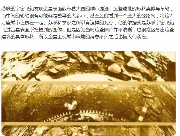 曾经,网络上有个文章是说:前苏联一艘无人船在那里拍下了一组惊人的照片显示,大约2万个城市曾建立在星球上。这些城市散布在金星表面,但都是倒塌的状态。