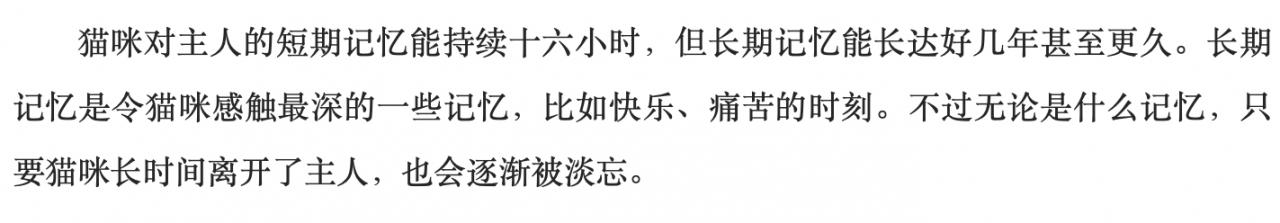 成年的猫咪智商其实并不低,大概相当于两三岁的小孩子,所以有些记忆,它记不清楚,但是比较难忘的记忆,猫咪还是能记住的,据说猫咪的短期记忆,大约只能持续十六个小时,而长期记忆却能记住好几年,如果印象十分深刻的话,猫咪甚至能记住一辈子。但是如果换了主人的话,估计猫咪没过多久就会把前主人忘掉。