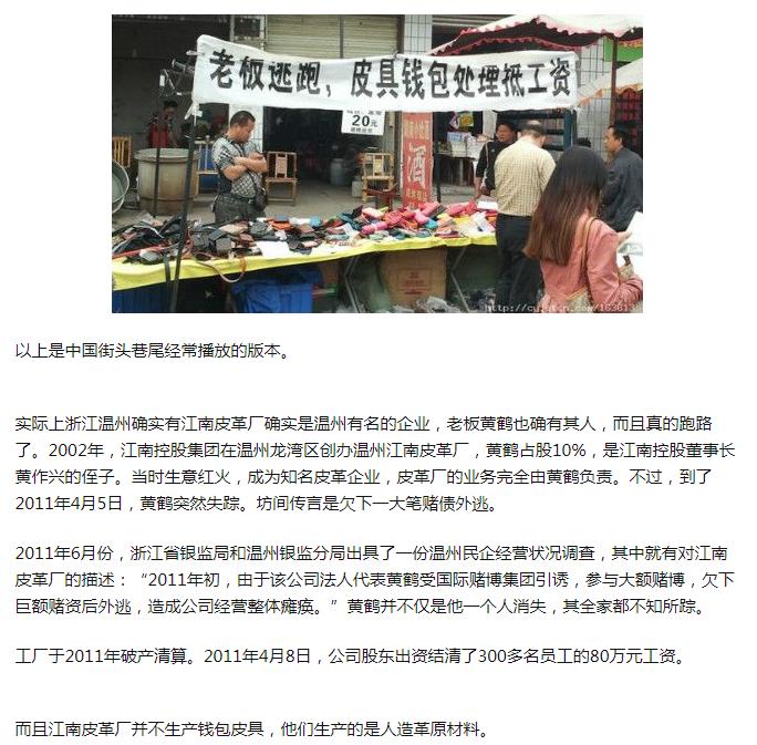 在浙江温州确实是有这么一家江南皮革厂,黄鹤也确实曾经是这家工厂的一把手,但是要说到江南皮革厂就不得不提到工厂的创始人,也就是黄鹤的叔叔黄作兴。当年黄作兴在创立江南皮革厂以后,工厂的效益还是很好的,由于黄作兴本人的兴趣爱好并不在此,于是他就让他的侄子黄鹤来管理公司,聪明灵活的黄鹤也确实经营有方,曾经一度让江南皮革厂的产值达到3.5亿,净利润几千万,但是黄鹤在小有成就后也确实开始飘了,还迷恋上了赌博。在2011年的时候,清明假期刚过,大家刚回厂却发现老板黄鹤就这么消失不见了,只剩下办公室里的一片狼藉,后来才知道原来是黄鹤欠了大量的赌债还不上于是干脆跑路了。至于他跑路时带走的是不是他的小姨子,网络上也是众说纷纭,一直没有确切的消息。