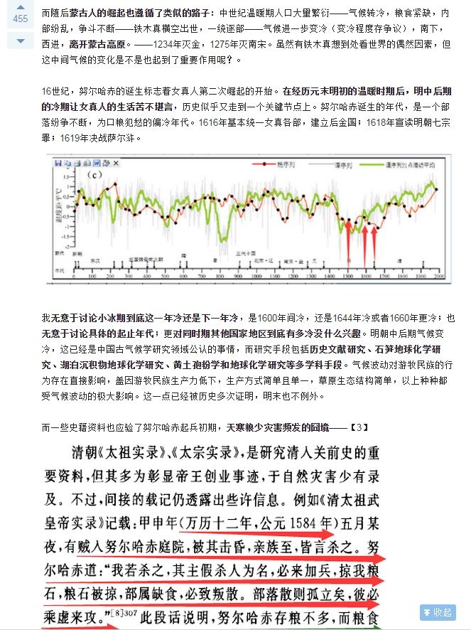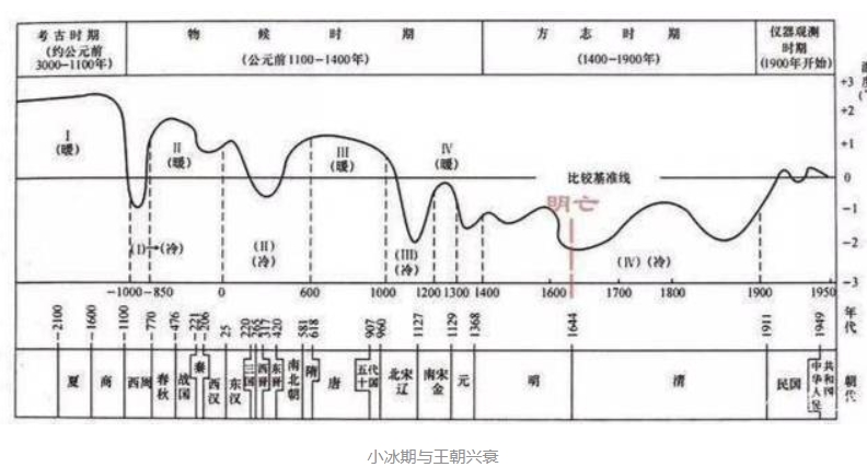 根据中国气象史的记载,我们历史上共经历过四次小冰期,第一次是殷商末期至西周初期,第二次是东汉末年至西晋初年,第三次是唐朝末年至北宋初年,第四次就是大家比较熟悉的明朝末年至清初的明清小冰期了,中国历史上的这四次小冰期都发生了类似的大事,就是都出现了朝代的更迭,这是为什么呢?其中很重要的一个原因是掌权者的腐朽统治,但是还有一个很重要的推波助澜的因素就是小冰期的出现。就拿离现在最近的一次小冰期—明清小冰期来说吧,当时正处于明朝末年,根据《明史》中的记载,明朝很多地方都出现了数尺的大雪,结果导致人和牲畜冻死的数以万计,还有冰雹、鼠疫、旱灾等次生灾害的相继出现,用民不聊生来形容明朝末年人们的生活是一点也不过分的。