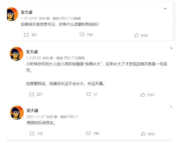 也许大家这几天还是高度关注一下她的事情,但是仅仅几天她就会被其他的信息所覆盖,大家能记住的关于她的名字就是安大魂,她的真名没有在任何地方揭露过,她的故事也没有像任何人讲述过,我们只能知道安大魂在这个举家欢腾的日子里面因为抑郁症去世了。