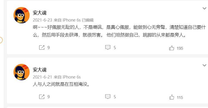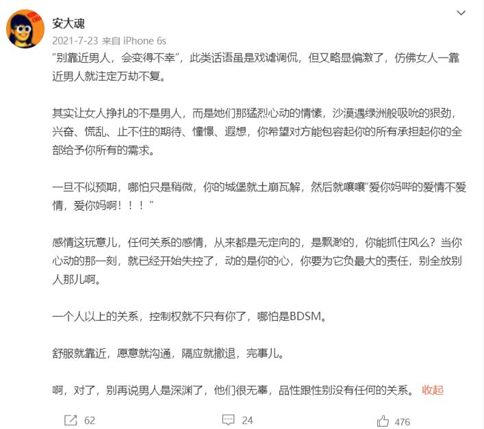 安大魂会得抑郁症,跟感情的发展不顺利有一定的关系,在她的微博还有很多社交平台上面,有很多她本人对感情的宣泄,那里充斥着苦痛和抑郁,仿佛全世界最悲凉的情感体验,而在她的发文中也是随处可见的对世界充满了失望与拒绝。