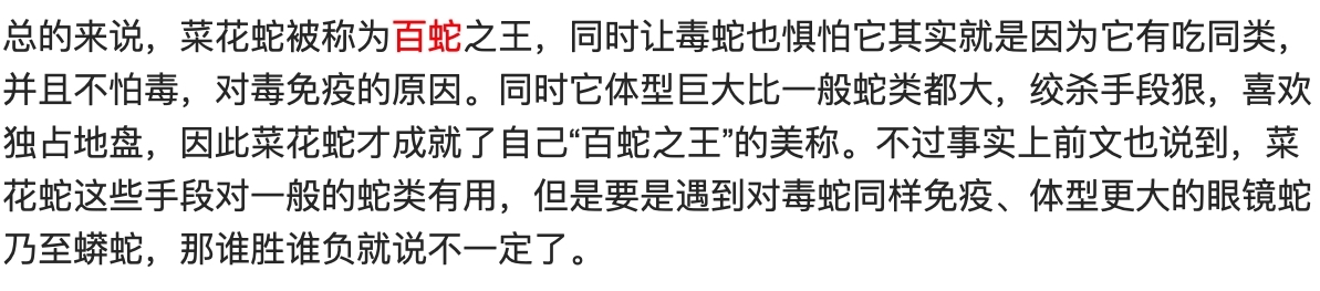 王锦蛇虽然本身没有毒性,但它能在遇到危险的时候,分泌一种特殊的气味,也就是“臭屁”,用来逼走对手,再加上王锦蛇对蛇毒是免疫的,就算是最毒的眼镜王蛇,对王锦蛇毫无办法,王锦蛇不但对蛇毒免疫,其本身绞杀能力也是很强的,再加上体型巨大,又食同类,因此别的蛇都对它敬而远之,也让菜花蛇的名气越来越大。