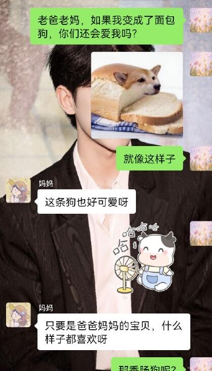 一个网友把该表情包发给了自己的妈妈,问她:假如我变成面包狗,你还爱我吗?妈妈说会的,网友又问:或者变成更丑的香肠狗呢?妈妈回答“不管你变成啥样我都爱你”之后该网友把聊天截图发到网上,引来众多网友的效仿,大家纷纷把表情包发给了自己的爸爸妈妈,问他们”假如我变成面包狗,你还爱我吗?”,每个爸爸妈妈的回答五花八门,但大多数父母的回答差不多都是“不管你变成啥样我都爱你”