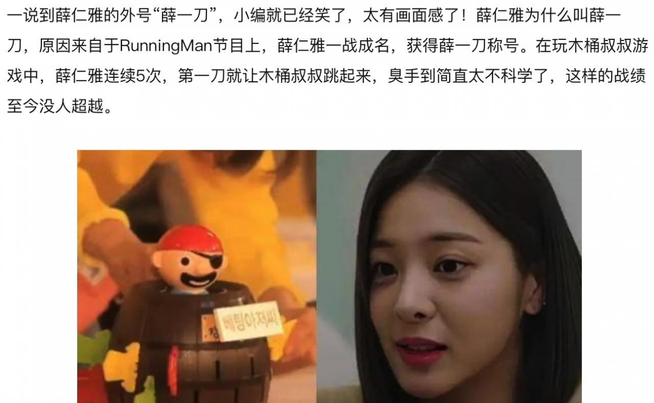 可能很多人都不知道,薛仁雅其实也是练习生出身,但是可惜因为一些原因,她并没有出道,后来自学考入了首尔艺术大学表演系,平时喜欢运动,有跆拳道三段的实力,而且综艺感爆棚,在参加韩版《running man》的时候,在玩木俑叔叔游戏的时候,薛仁雅第一刀就让木桶叔叔跳了起来,连续五次都是如此,因为太不科学,所以火速出圈,也因此获得称号“薛一刀”。
