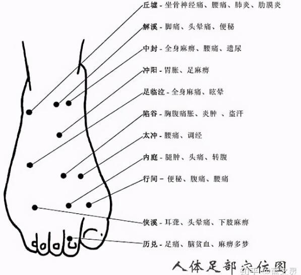 11、肝胆经:足少阳胆经取丘墟,精准定位在外踝前正下方,趾长伸筋腱两侧凹痕中。