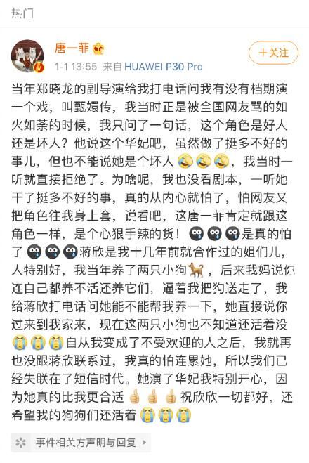 而今天,唐一菲微博回应当年拒绝郑晓龙导演出演华妃邀约的话语又再度引起热议,唐一菲称当年是郑晓龙的副导演打电话给自己的,只是华妃这个角色不是什么好人,所以自己给辞了。