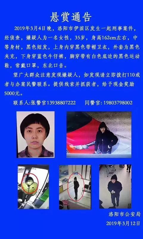 3月12日,市公安局发布悬赏通告:3月4日晚,伊滨区发生一起刑事案件,犯罪嫌疑人为一名女性,35岁,中等身材,黑色短发,上身内穿黑色连帽卫衣,外套为黑色夹克,下身穿蓝色牛仔裤,东北口音,望广大群众注意发现嫌疑人,提供线索并抓获者,给予现金奖励5000元。通告下方配有犯罪嫌疑人的照片。